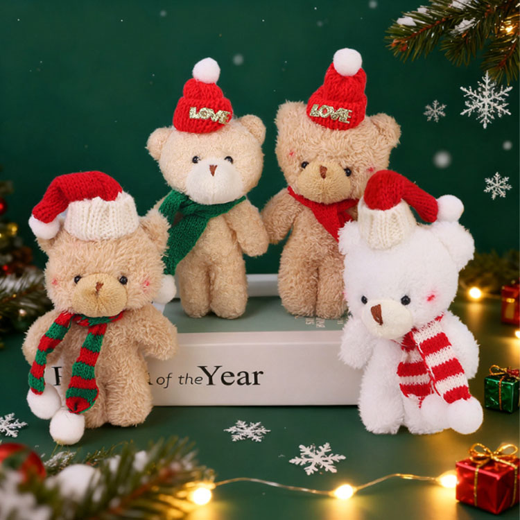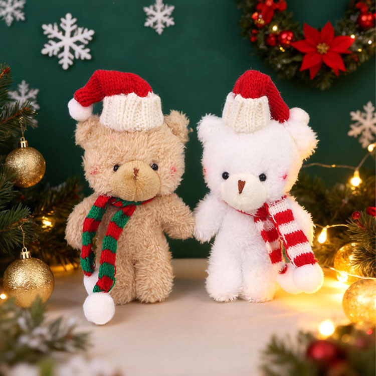 Dette julefyldte legetøj er i form af en bamse, det har to forskellige materialer, nemlig plys og bamse fleece. Teddy fleece -pelsen er lidt krøllet. Begge materialer har en glat og blød struktur og er meget lette. Teddy fleece bjørn kommer i to farver: lysebrun og mørkebrun. Den overdådige bjørn har også to farver: brun og hvid. Hver bjørn er parret med et andet tørklæde, og hver bjørn bærer en rød jul hat og tilføjer et festligt touch. Bjørnens tørklæder og hatte strikkes og er dekoreret med hvide pompomer og ser meget delikate ud. Bjørnens øjne er sorte, og dens kinder er prikket med rødme, hvilket gør det meget søde. Dets udseende har vundet mange kunders kærlighed.