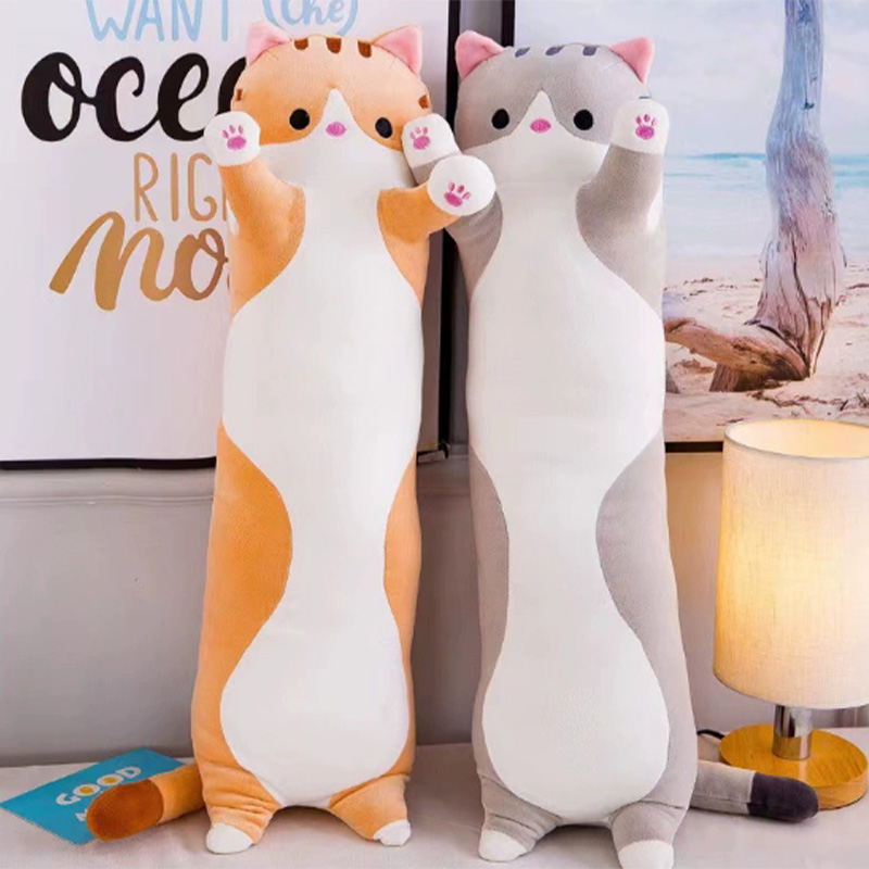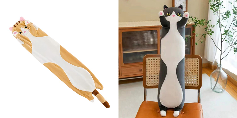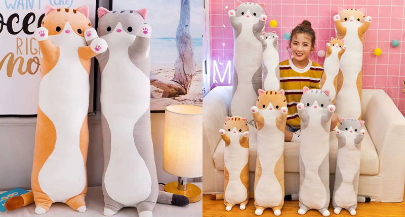 Delang katteplysende kropspudeHar et sødt udseende og praktiske funktioner. Det er både et overdådigt legetøj og en pude.