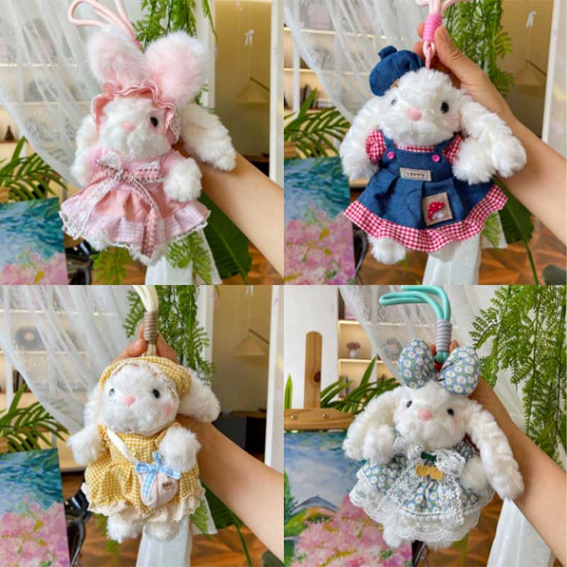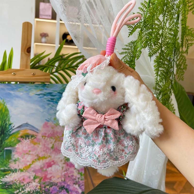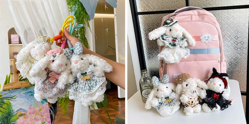 Blandt disse små kaniner bærer nogle små kjoler, nogle bærer små forklæder, og andre bærer små tørklæder. Deres tøj kan skiftes frem og tilbage. Du kan lave din egen DIY til dette vedhæng og oprette din egen matchende stil. Deres tøj er meget udsøgt med blonderdekorationer, og de er ekstremt smukke. Desuden har de små kaniner også tilbehør: sommerfuglblomster og en lille hat. Nogle har endda en taske knyttet.