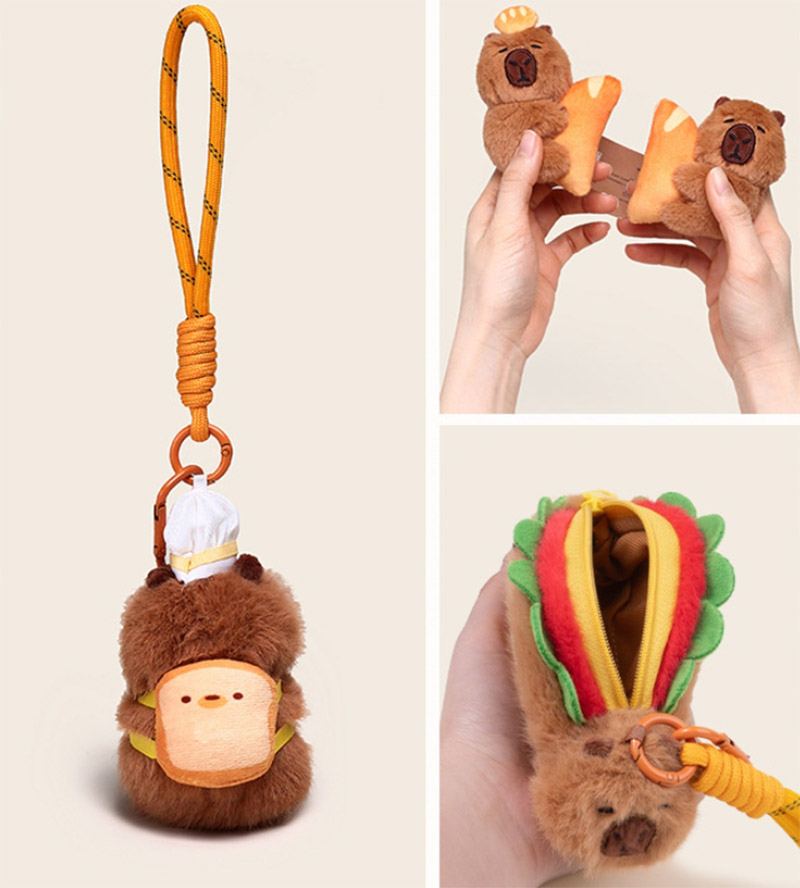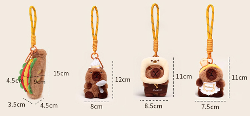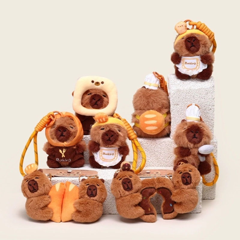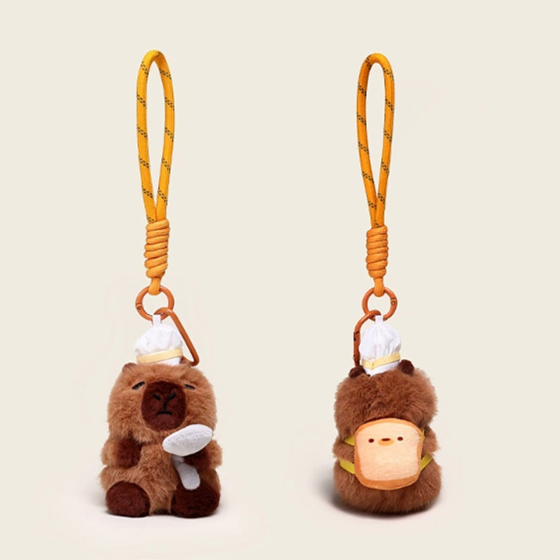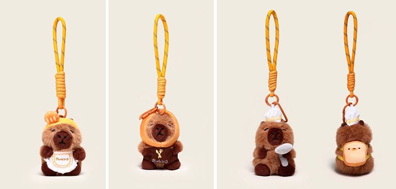 Disse overdådige nøgleringer er designet baseret på prototypen af en "capybara". Denne serie har mange stilarter. Den overordnede stil er sød. De ligner ligesom i et bageri eller bagestue, hvilket er meget interessant. Capybaraen er varmt brunt udseende, modellering er meget frugtagtig, udtryk er meget rig, ser meget sød ud. Nogle af dem er dekoreret med brødrelaterede ornamenter: capybaras med toast på hovedet, capybaras med brød på ryggen, capybaras med kokhatte på hovedet og capybaras med forklæder omkring deres kroppe. De er ligesom små kokke i et bageri. Nogle capybaras er designet til at holde brød eller interagere med det. Hvert look er meget sød.